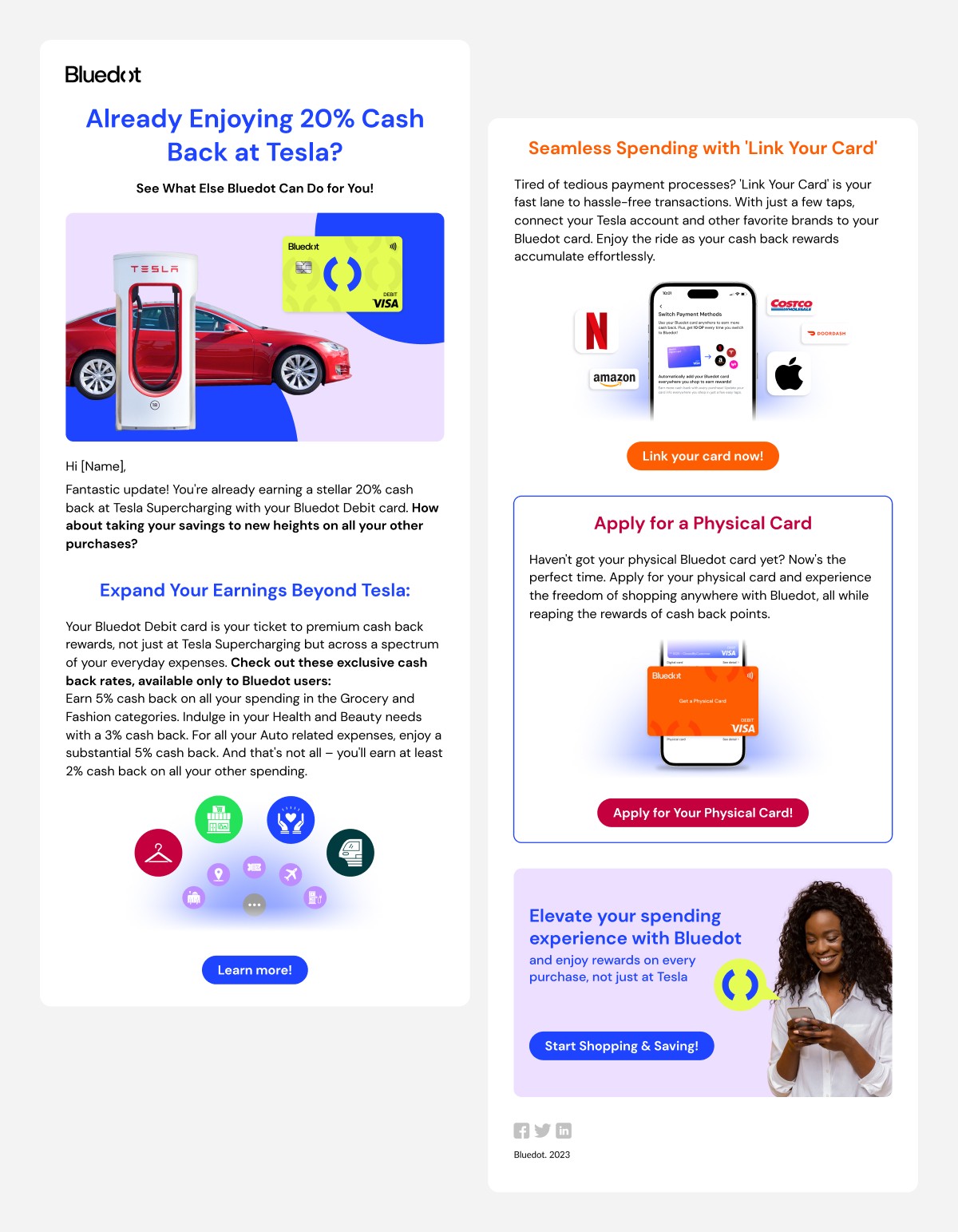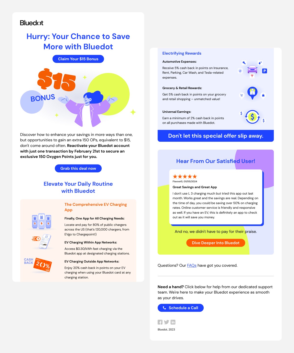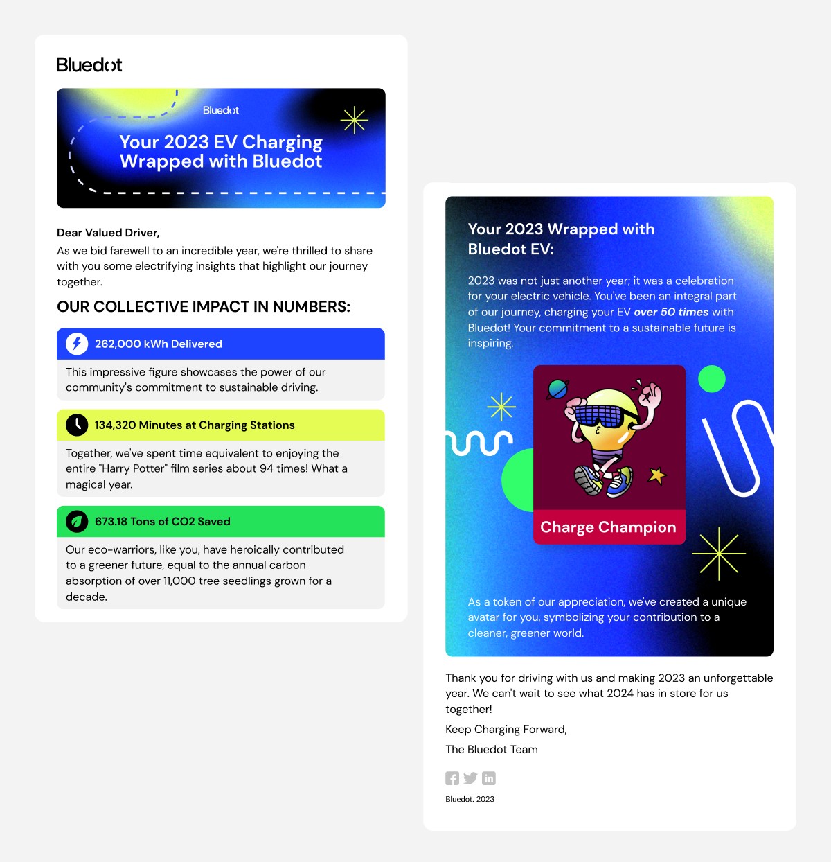Each email was designed with a personalized approach, focusing on relevance and user engagement. I introduced fun elements to celebrate special events, from holidays to user milestones, ensuring each email felt fresh. The layouts and visuals were crafted to reflect Bluedot’s brand personality, with a friendly and approachable tone that connected with users on a personal level.