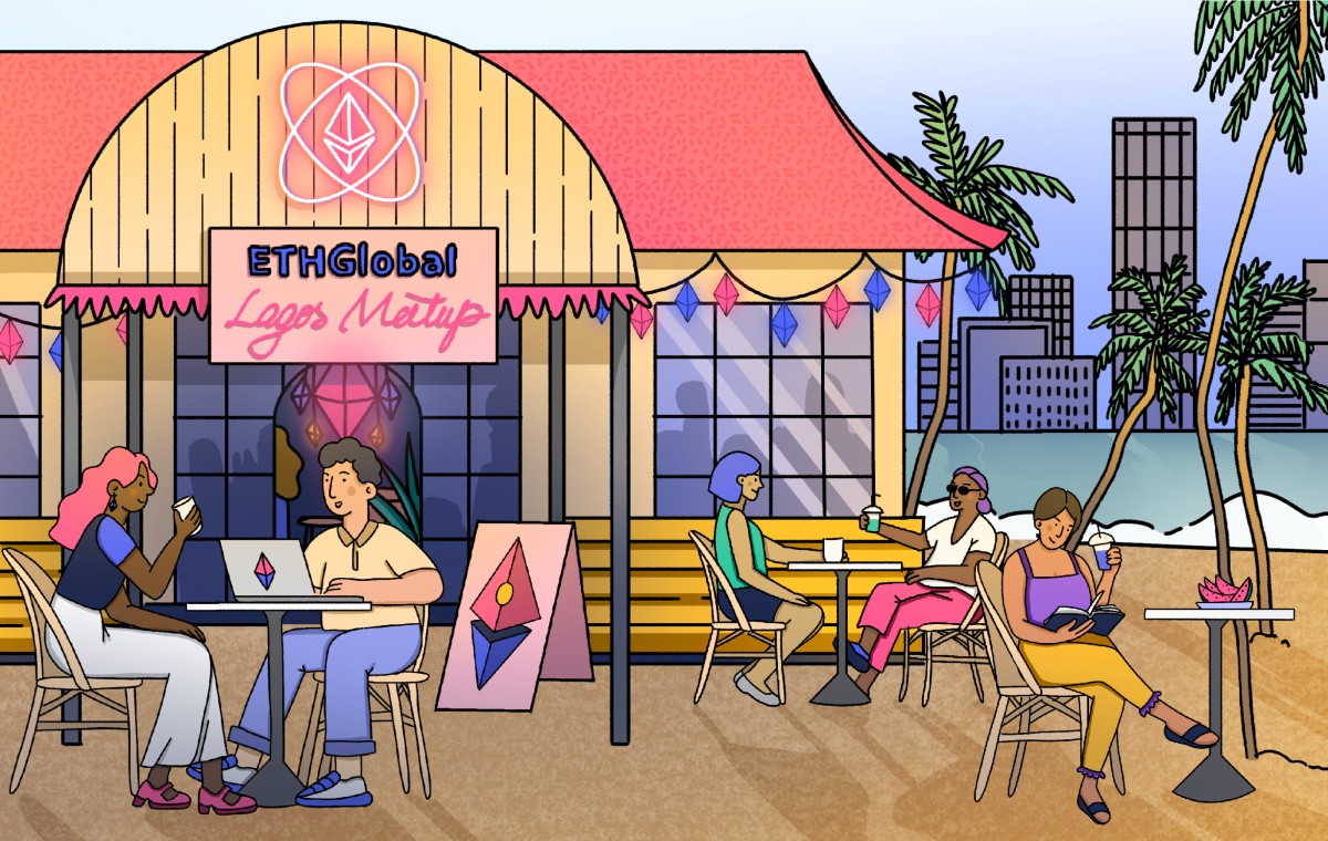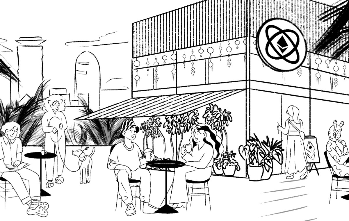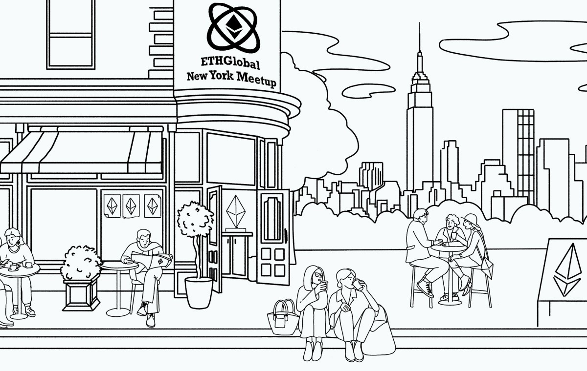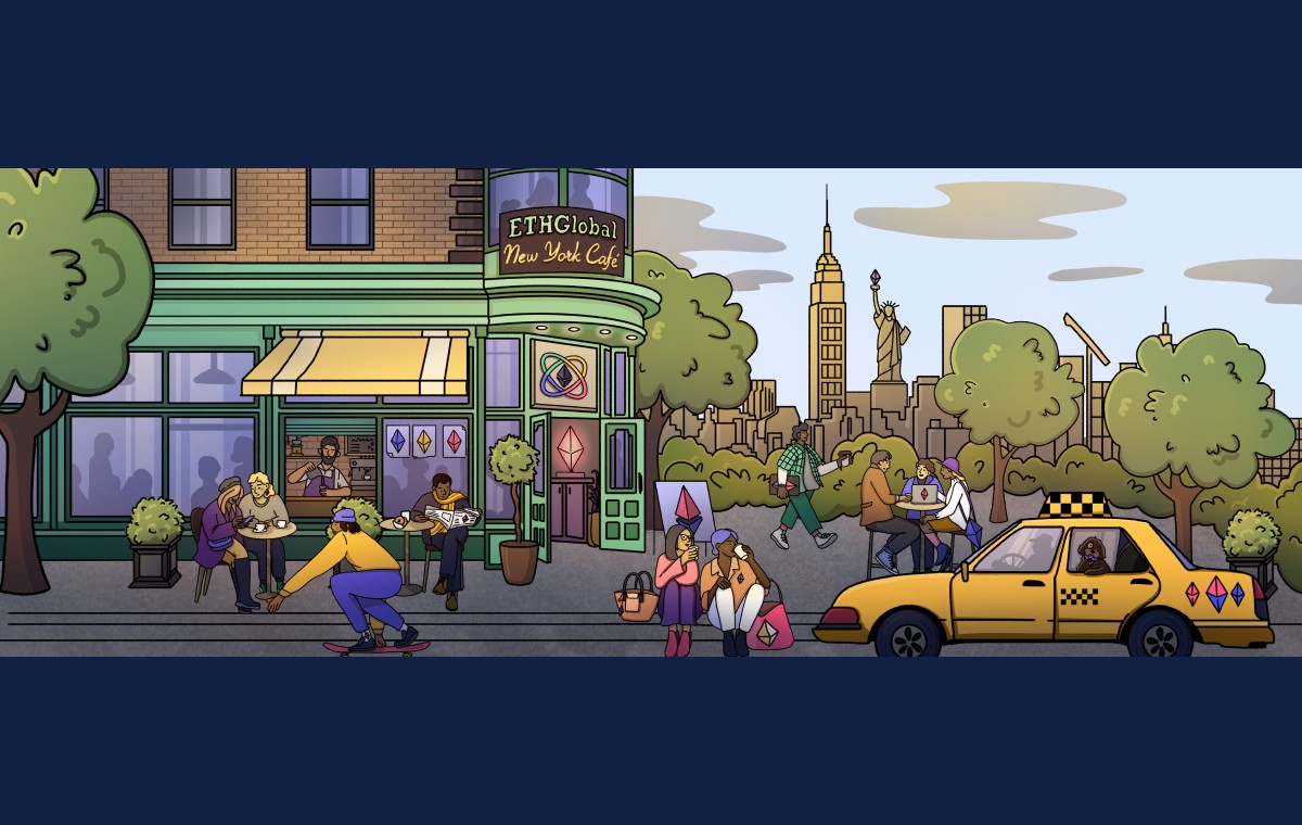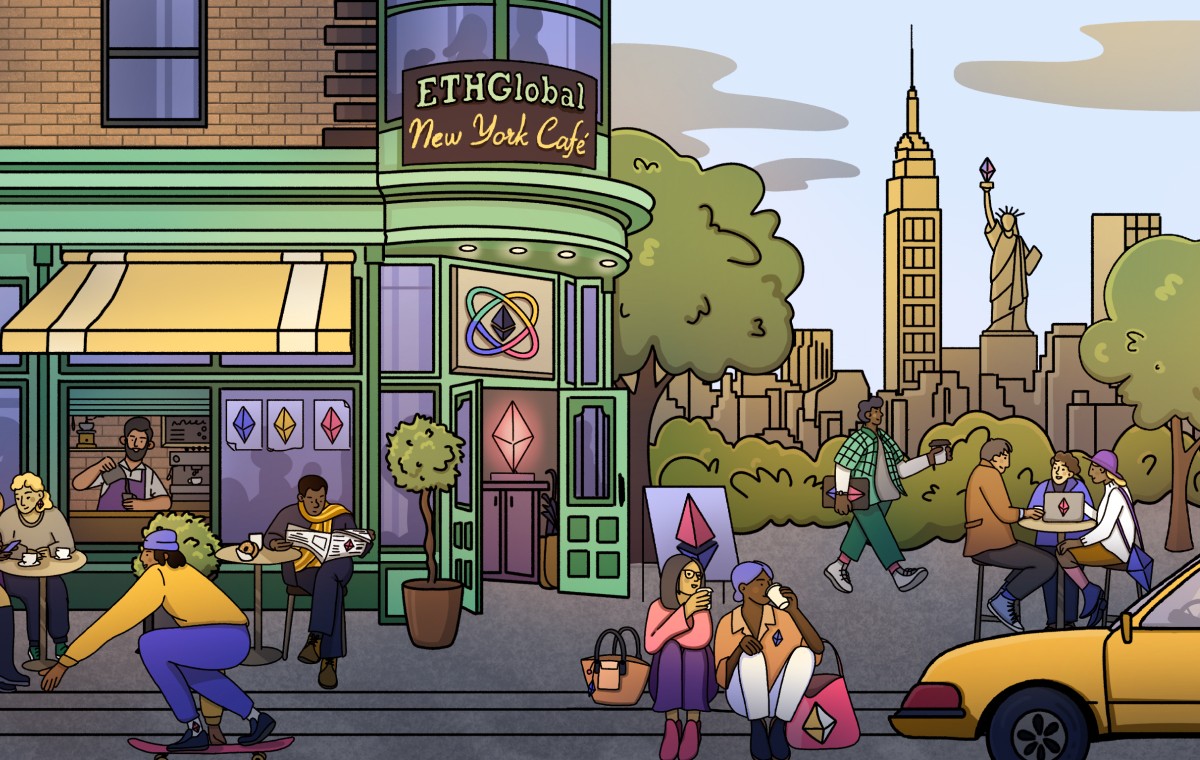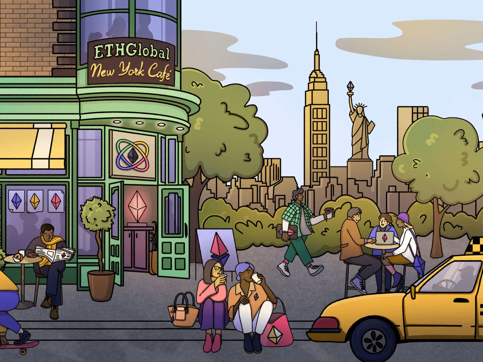 For the New York event, I illustrated a scene featuring people networking outside of a classic Brooklyn-style cafe. The environment captures the local culture, with Ethereum logos hidden throughout the scene as an engaging nod to the event's theme.
