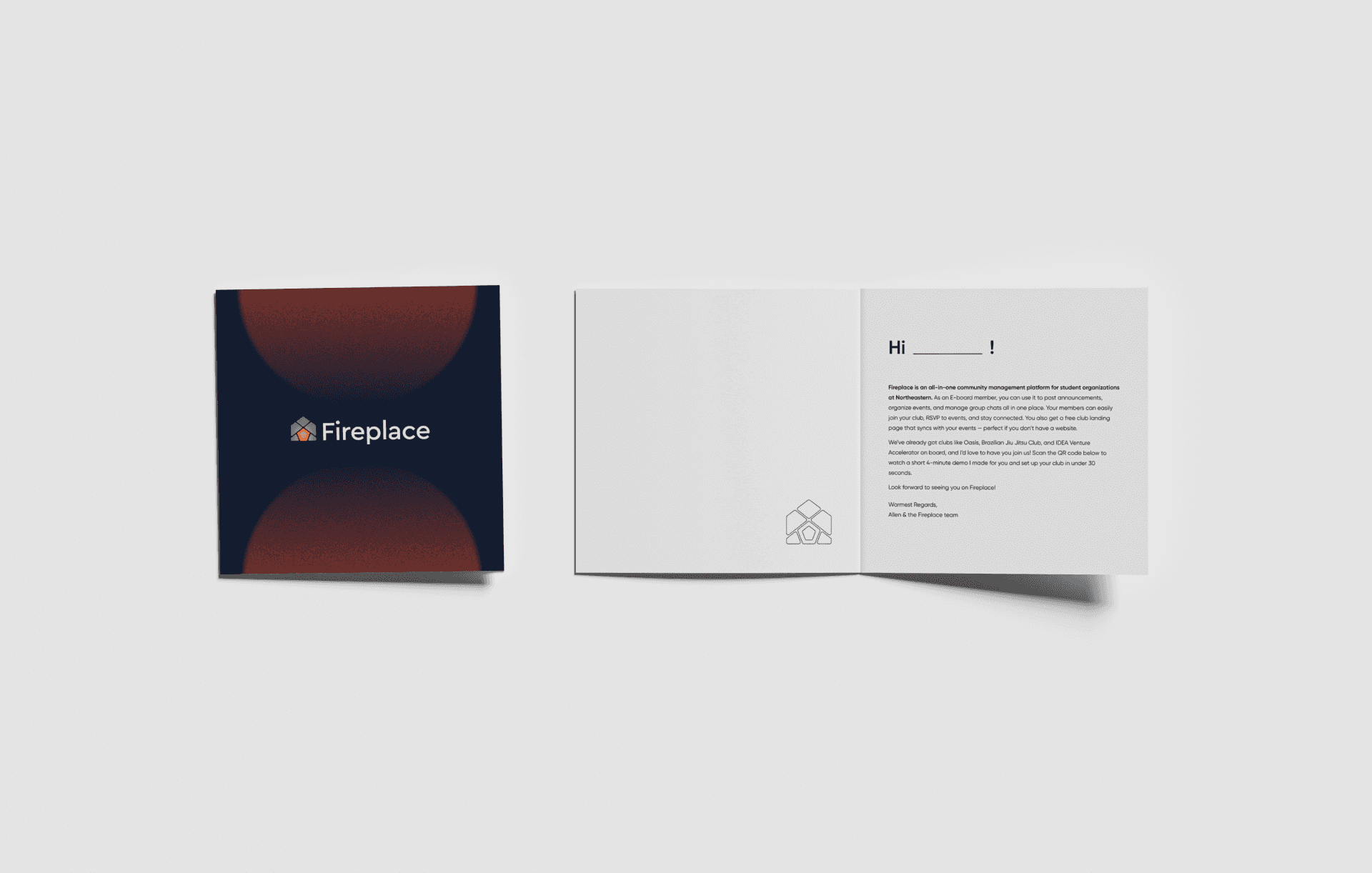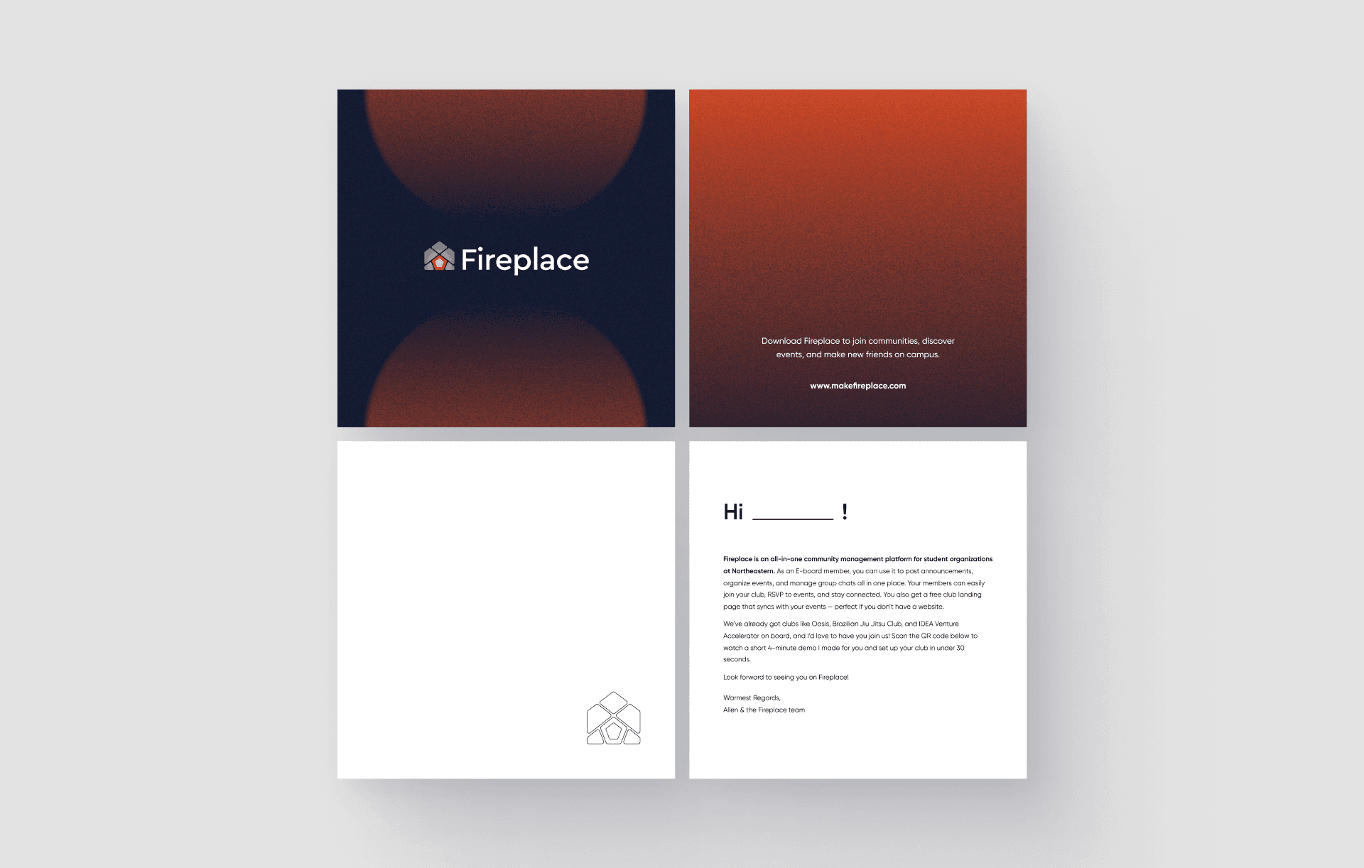 For this project, I created two types of handout materials: business cards for direct contact with potential clients and invitation cards for sending to community organizers to help them onboard to the Fireplace platform.