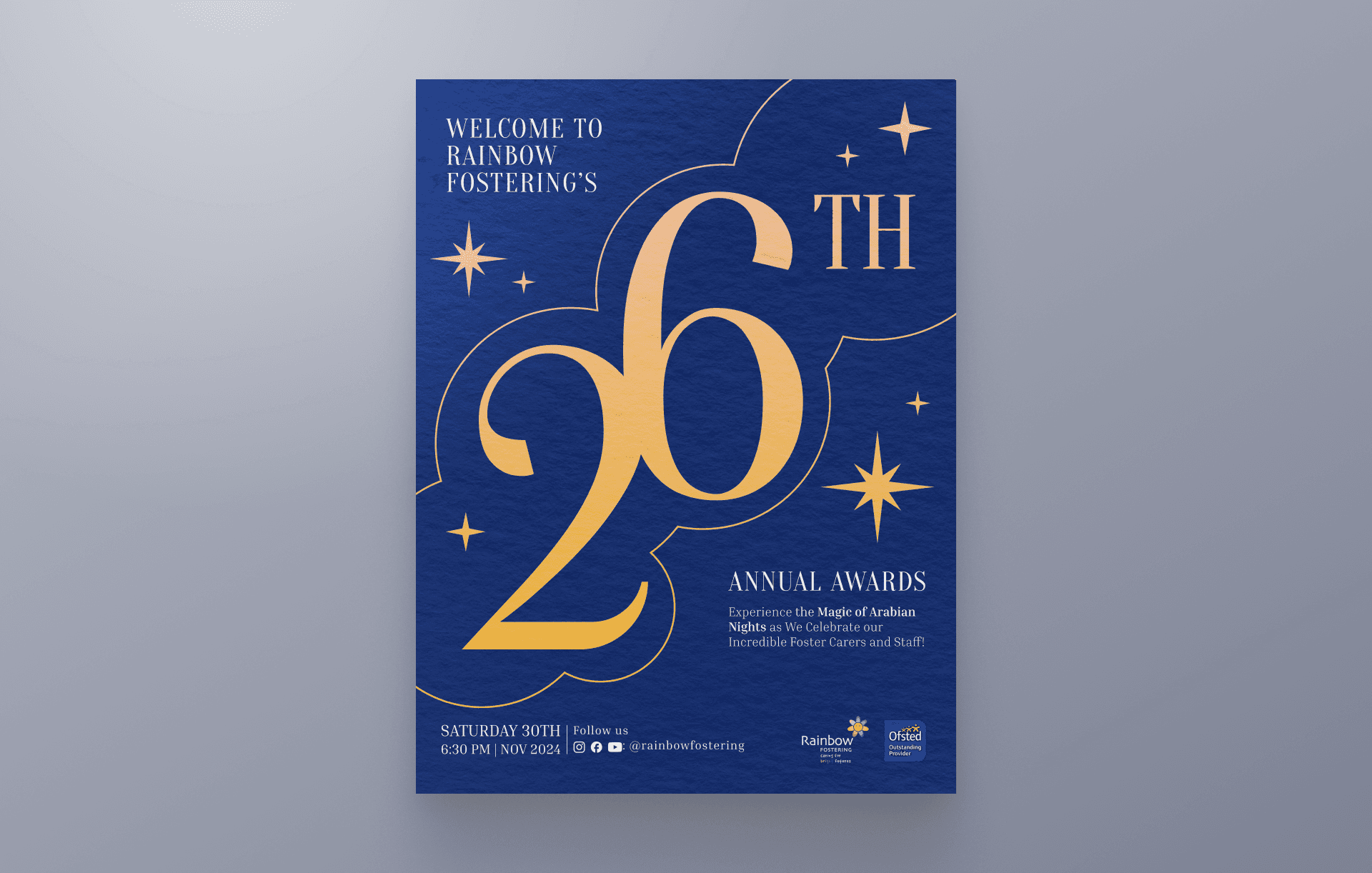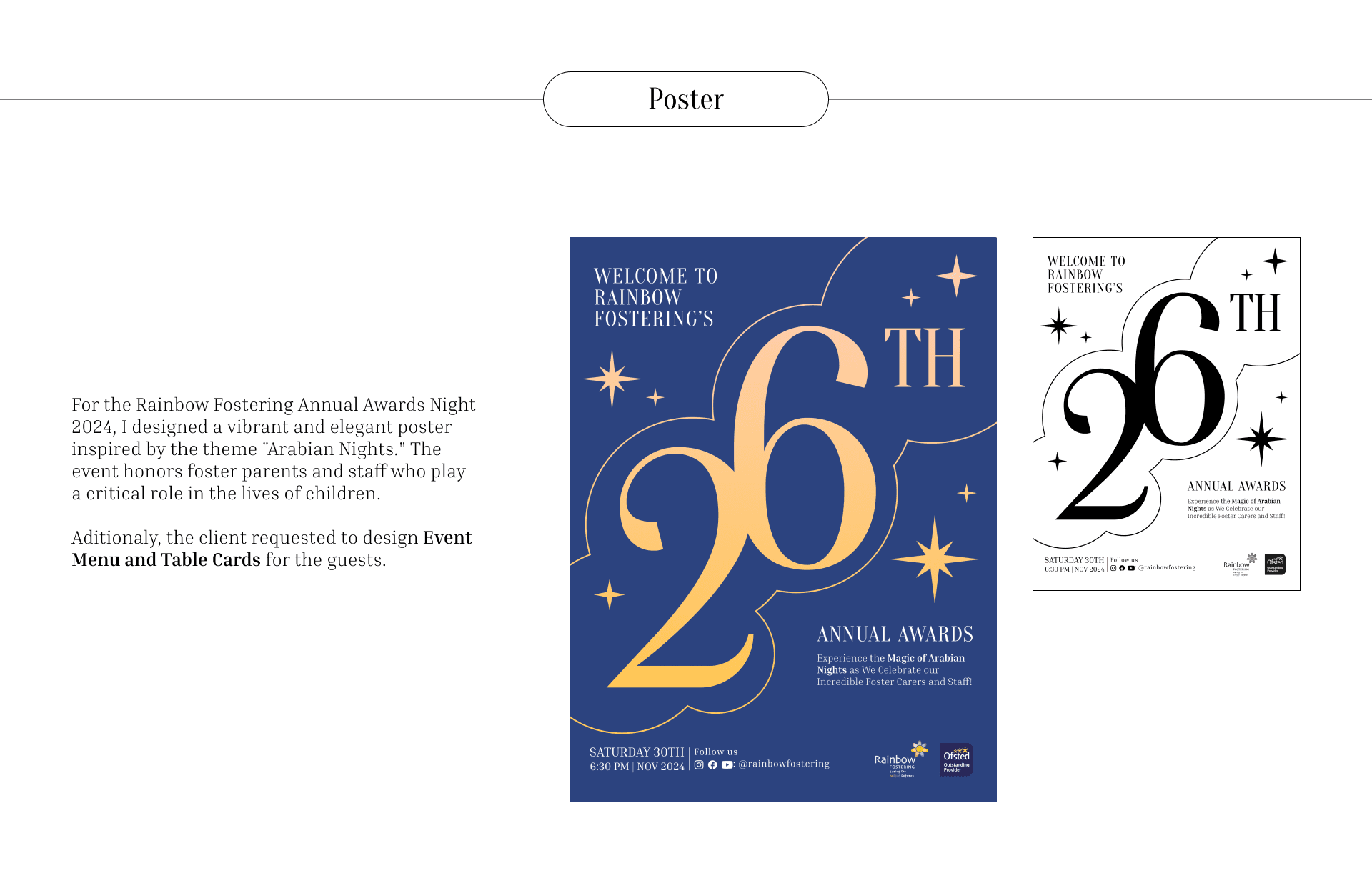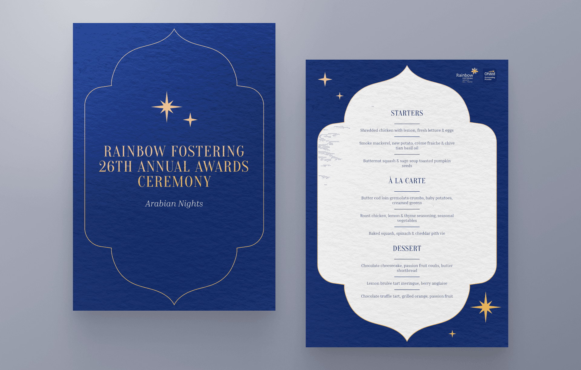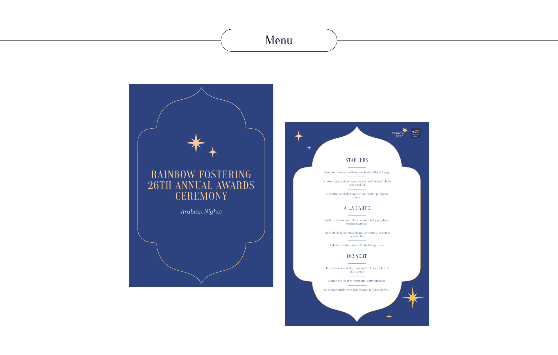 Rainbow Fostering Annual Awards Night is a celebration honoring the incredible contributions of foster parents and staff. I created a poster, menu, and table cards for this event.