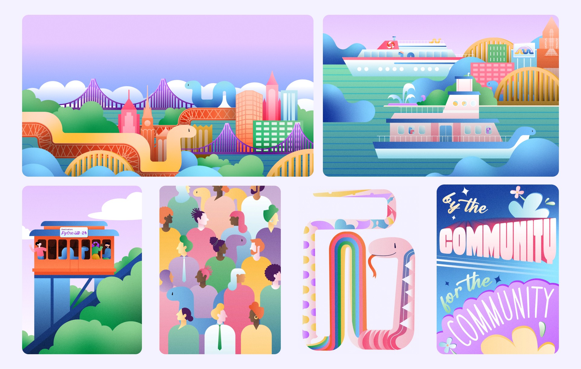 I developed a set of illustrations that combined landmarks of Pittsburgh with Python themes, creating a visual narrative that connects the event to its host city. A bright and colorful palette was used to symbolize the diversity and inclusivity of the Python community, ensuring the visuals felt welcoming and vibrant.