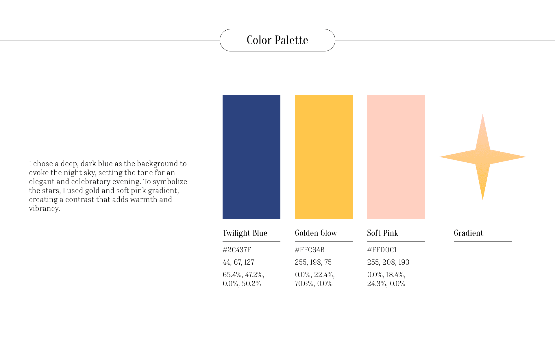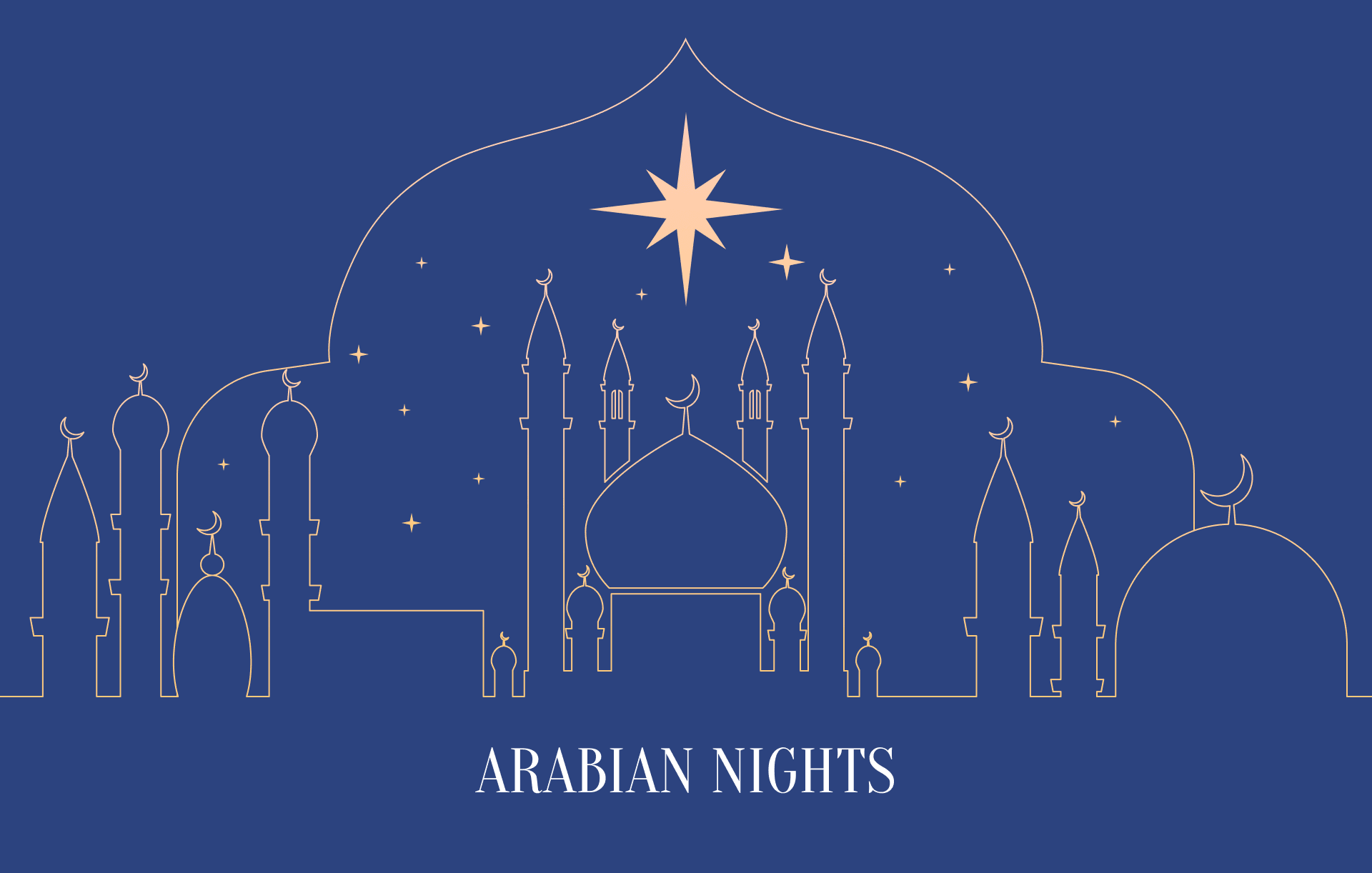 I used a contrasting color palette, dynamic typography, and symbolic elements to create an inviting and celebratory atmosphere that perfectly reflects the spirit of "Arabian Nights."